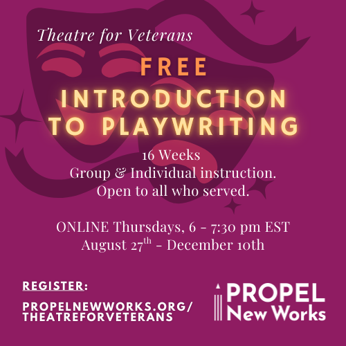 Propel New Works offers free playwriting & screenwriting classes for military veterans and current servicemembers with access to video conferencing. Those who wish to stick around after completing our classes can join our bi-monthly writers’ group. All writing abilities are welcome.